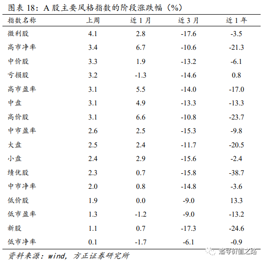 具体来看,上周中盘股涨幅相对大盘股和小盘股明显,上周中盘、大盘、小盘风格指数分别上涨3.1%、2.5%和2.4%。上周高市净率风格指数涨幅领先,单周上涨3.4%。中市净率和低市净率风格指数表现次之,分别上涨2.0%、0.1%。微利股表现好于亏损股及绩优股,三类风格指数单周分别上涨4.1%、3.2%和2.3%。新股单周小幅上涨1.1%。