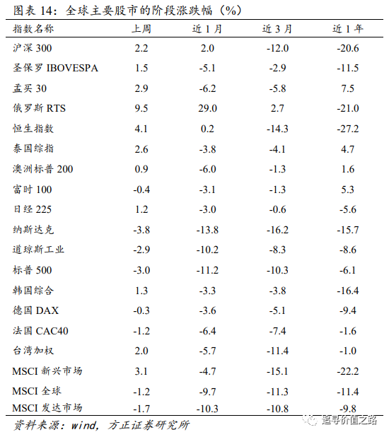 从全球权益市场来看,上周海外发达市场多数下跌,新兴市场多数上涨,俄罗斯RTS和恒生指数大幅上涨。