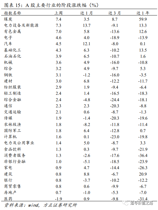 上周各一级行业普遍上涨,其中煤炭、电力设备及新能源、有色金属大涨。
