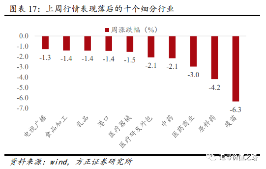 从我们筛选的108个细分行业来看,上周行情表现领先的前5名细分行业及周涨跌幅分别是非金属材料(+12.1%)、光伏设备(+11.6%)、金属新材料(+11.4%)、能源金属(+9.8%)、风电设备(+9.7%)。上周行情表现落后的后5名细分行业及周涨跌幅分别是疫苗(-6.3%)、原料药(-4.2%)、医药商业(-3.0%)、中药(-2.1%)、医疗研发外包(-2.1%)。上周疫苗行业大跌,医药行业普遍下跌。