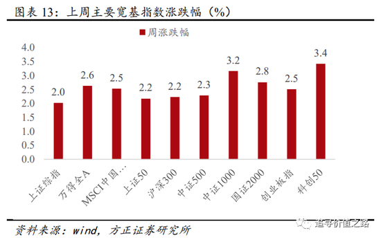 从主要宽基指数来看,上周主要宽基指数普遍上涨,涨幅普遍超过2%