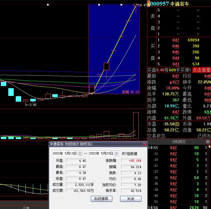 5月23日,中通客车再度涨停,截至收盘,报8.47元,总市值达50.22亿元,连续7个交易日涨停,期间累计涨达95.16%。