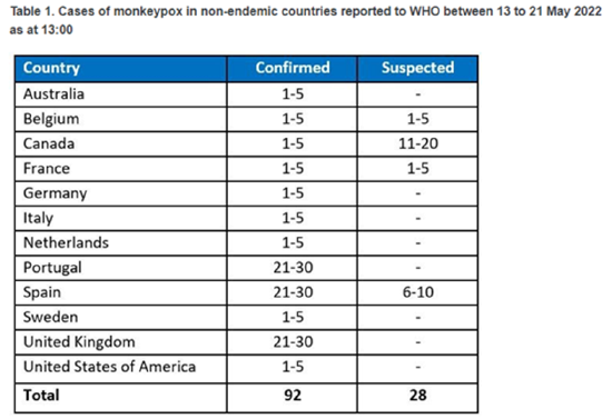 截至5月21日13:00,世卫组织三个地区的12个非猴痘病毒流行的成员国向世卫组织报告了92例实验室确诊病例,以及28例正在调查的猴痘疑似病例。到目前为止,还没有相关的死亡报告。