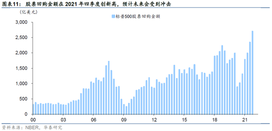 股票回购成本上升冲击尚未显现,预计未来回购规模可能会明显减少,从而对美股形成拖累。根据标普公司最新数据,标普500公司在2021年四季度的回购金额是创历史新高的2701亿美元,但预计从2022年一季度开始这一数值会大幅减少。参考2008年金融危机爆发后,回购金额一度降至此前的15~20%。