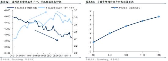 短期市场逻辑在“滞”不在“胀”,更符合衰退交易的特征,但仍需关注通胀下行斜率和7月之后滞胀交易卷土重来的可能。4月美国通胀见顶回落,联储6、7月加息50BP几乎完全被市场计价,短期内市场核心矛盾可能会从“胀”切换到“滞”,近期股市继续下跌而美债收益率拐头向下也印证了这一点。不过4月核心CPI保持韧性,通胀下行的斜率仍是决定联储后续政策的核心变量。如果通胀持续高位不落,即便排除单次75BP的选项,仍存在联储在剩下的会议上都加息50BP、在年底将基准利率提升至3%以上的可能。从7月开始,市场会寻找更多对未来加息路径的指引,一旦出现超预期的鹰派信息,有可能把市场重新带回滞胀交易的逻辑。