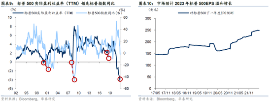 股价中已经开始部分反映盈利下行的影响,不过这一过程可能会持续数月,而更大的不确定性是尚未被市场充分计价的衰退风险。市场对盈利下行的反映往往存在时滞,股价的调整滞后于实际盈利的调整,根据Bloomberg数据,标普500实际盈利收益率(经过通胀调整的盈利/股价,TTM)领先标普指数同比大概6~12个月左右。目前标普实际盈利收益率正处于探底阶段,预计未来数月盈利将持续对美股产生压力。基本面下行的风险可能尚未完全反映在对未来盈利的预期中,根据Bloomberg统计,机构预计2023年标普500的EPS依然会温和增长,说明衰退风险并没有充分被市场计价,或是未来更大不确定性的来源。