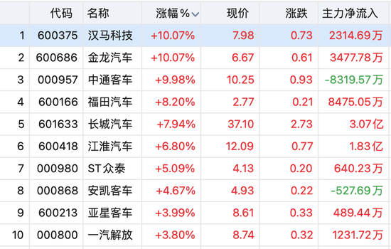 汽车整车板块持续走强。截至收盘,汉马科技、金龙汽车、中通客车涨停,福田汽车涨超8%,江淮汽车、长城汽车、安凯客车、长安汽车等股拉升跟涨。