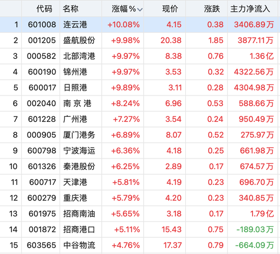 港口航运股震荡走强,连云港、盛航股份、北部湾港等个股涨停。