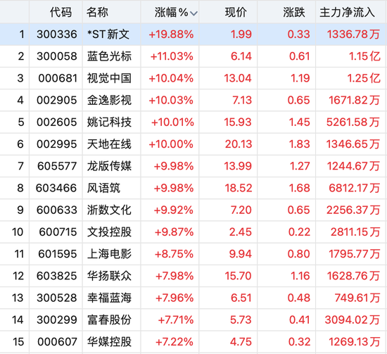 午后影视传媒板块持续走强,浙数文化、视觉中国、金逸影视、姚记科技、天地在线等近10只个股涨停。