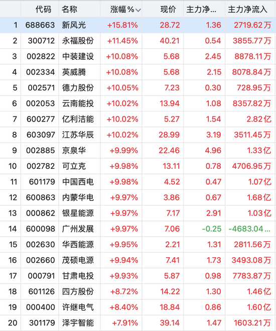 公司所属的光伏板块,午后亦整体震荡走高,中装建设、英威腾、德力股份、亿利洁能、云南能投等10余只个股涨停,新风光大涨超15%。