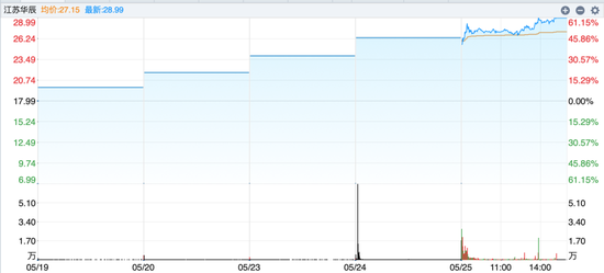 截至收盘,江苏华辰报涨停价28.99元/股,总市值为46.38亿元,成交量3333.24万股。