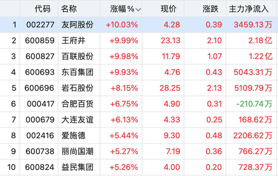 零售业板块大幅走强多股涨停。友阿股份、王府井、百联股份、东百集团涨停,上海九百、合肥百货等跟涨。
