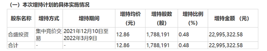 按照正业科技此前公告,其控股股东合盛投资于2021年12月10日至2022年3月9日通过集中竞价交易方式累计增持公司股份约178.82万股,占公司总股本的0.48%,增持金额约为2299.53万元,增持均价为12.86元。