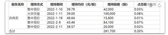 在1月10日至2月11日,国安达实控人之一、董事长兼总经理洪伟艺通过二级市场交易累计增持公司股份26.17万股,占公司总股本的0.20%,增持价格区间38.57元/股-49.64元/股,累计增持金额1077.20万元。