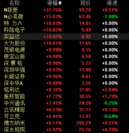 消息一出,相关板块闻风而动,深圳本地股大涨。消费电子的大本营深赛格、深圳华强直线拉涨停,还有特立A、科陆电子、实益达、大为股份、茂硕电源、银宝山新等十余股涨停。
