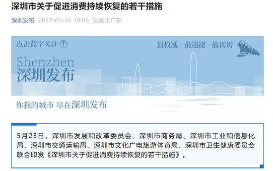 5月26日上午,深圳发布了《深圳市关于促进消费持续恢复的若干措施》。深圳市将从汽车消费、电子消费、信创产品消费等九大方面促进消费,共30条措施。简单来说,就是深圳市政府对居民购买新能源汽车、装修、家电、手机电脑等给予一定比例补贴。