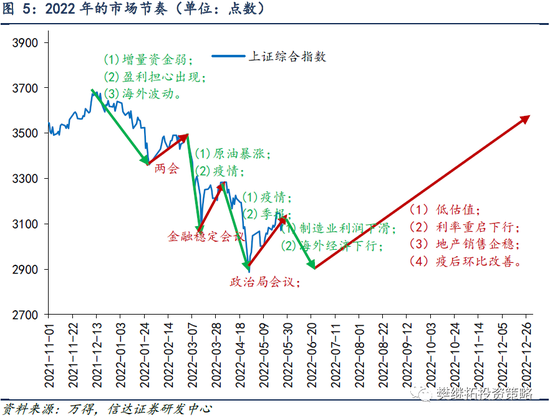 (3)我们的判断:反转关注预期和资金,而不是盈利。2022年下半年,大概率会见到宏观领先指标的改善和1个季度的盈利环比改善,但盈利和经济同步指标下降的趋势还很难快速回升,要想完全扭转,估计至少要到2023年上半年。主要原因是,历史上几乎所有的稳增长政策发力后,都是最先见到信贷和房地产销售等领先指标企稳,而由于产业链传导、库存等的影响,经济同步指标和盈利的改善大多会滞后半年。2020年3月之所以没有滞后,很重要的原因是2018-2019年已经有过稳增长了,部分领先指标在2019年已经稳定下来了,所以2020年3月疫情后的经济恢复,是三种力量共同作用的结果:2018-2019年稳增长滞后影响 + 库存周期 + 2020年稳增长进一步发力。2022年可能只有2021年Q4以来的稳增长政策这一种力量。