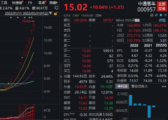 5月31日,中通客车尾盘再度涨停,收获13连板,报15.02元,成交额超20亿元。
