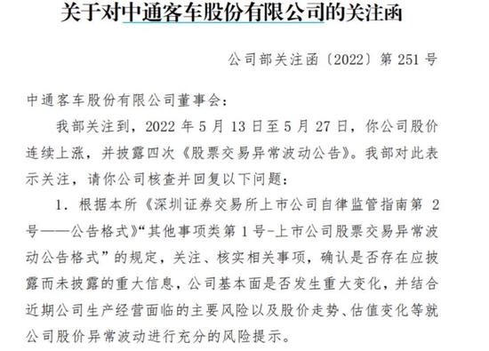 5月27日,狂揽11个涨停后,中通客车收深交所关注函。