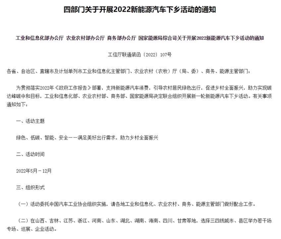 工业和信息化部办公厅、农业农村部办公厅、商务部办公厅、国家能源局综合司关于开展2022新能源汽车下乡活动的通知表示,为贯彻落实2022年《政府工作报告》部署,支持新能源汽车消费,引导农村居民绿色出行,促进乡村全面振兴,助力实现碳达峰碳中和目标,工业和信息化部、农业农村部、商务部、国家能源局决定联合组织开展新一轮新能源汽车下乡活动。