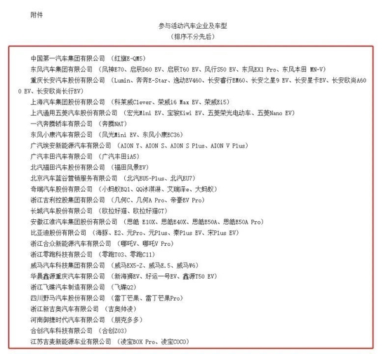 在公布的参与活动企业及车型目录当中,包括有一汽、东风汽车、上汽、长安汽车、比亚迪、长城汽车、吉利汽车等等。