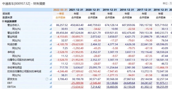 到了2021年,中通客车亏损近2.2亿元,业绩为上市以来新低。2021年也是中通客车上市22年来,首次出现亏损情况。今年一季度该公司净利润同比微增11.12%,但仍亏损3528.7万元,而扣非后净利润已连续3年为负。