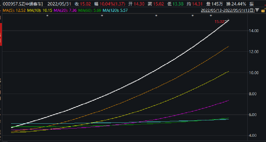自5月13日底部涨停启动以来,中通客车已经连续13个交易日涨停,累计涨幅达251.76%。