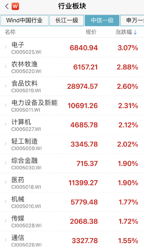 中信一级行业中,除房地产、汽车、煤炭、建筑下跌外,其余均上涨;其中,电子、农林牧渔、食品饮料涨幅居前,分别上涨3.07%、2.88%、2.60%。