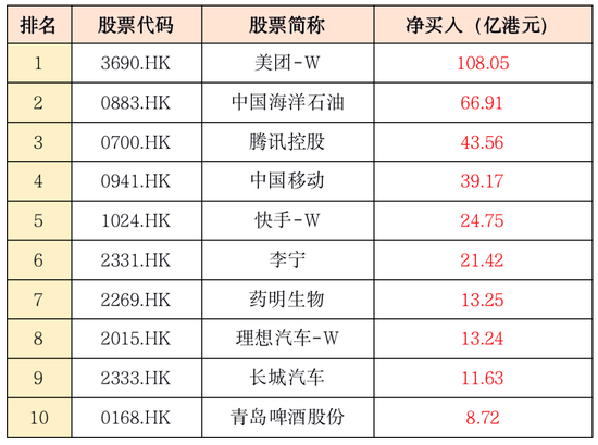 新经济(信息技术)仍是南向资金加仓重点。Wind数据显示,美团-W获南向资金净买入108.05亿港元,腾讯控股获43.56亿港元净买入,快手-W则获24.75亿港元净买入。大消费方面,汽车股理想汽车-W和长城汽车分别获南向资金13.24亿和11.63亿港元净买入,运动服装股李宁获21.42亿港元净买入,食品饮料股青岛啤酒股份则有8.72亿港元的净流入。