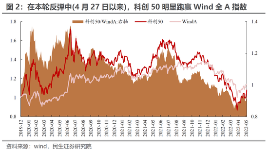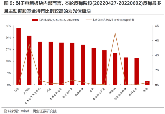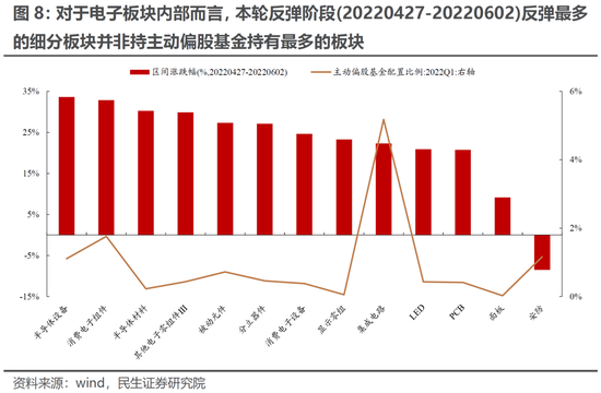 另一方面,如果进一步探究电子、电新板块的细分领域来看:对于电子板块而言,本轮反弹阶段(20220427-20220602)反弹最多的细分板块并非持主动偏股基金持有最多的板块;对于电新板块而言,反弹最多且主动偏股基金持有比例较高的仅为光伏板块。这意味着即使在表现强势的“赛道”板块内部,分化同样仍在发生,其实赛道反弹过程中是在“缩圈”,而不是此前赛道风格的回归。