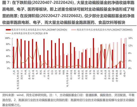 一方面,在下跌阶段(20220407-20220426),电新、电子、医药等板块对主动偏股基金的净值形成了明显“拖累”,食品饮料板块则有所支撑,而在反弹阶段(20220427-20220602),基金重仓板块中,电新、电子等板块可能在推升主动偏股基金的净值,而医药、食品饮料等板块则有所“拖累”。这意味着在一级行业层面,电新、电子板块与医药、食品饮料板块可能已经开始分化。