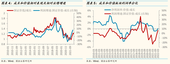 成长和价值板块的相对利润增速与板块相对市场表现呈现明显的正相关。从相对业绩角度来看,中下游利润率改善将驱动成长相对价值板块业绩占优。2021年下半年以来上游资源品涨价对中下游利润持续形成挤压,而上游资源品行业大部分均属于价值风格,因此价值板块净利润增速相对成长板块改善显著。但正如我们前文提到的,随着下半年资源品涨价趋缓,也就是上游采掘PPI见顶回落阶段,中下游利润率将得到改善。在此基础上,集中在中下游的成长板块相对业绩将明显改善。