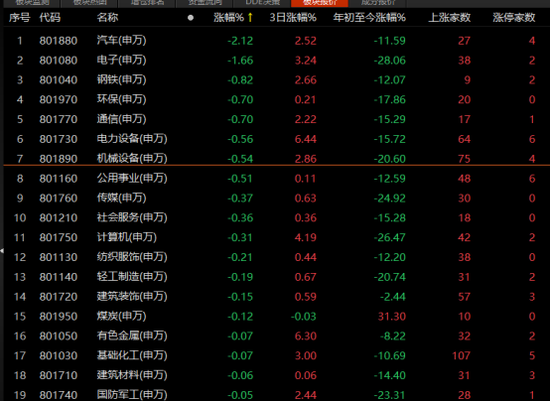 而汽车板块今日跌逾2%,电子板块以1.66%跌幅紧随其后,通信、电力设备、机械设备等板块下跌。