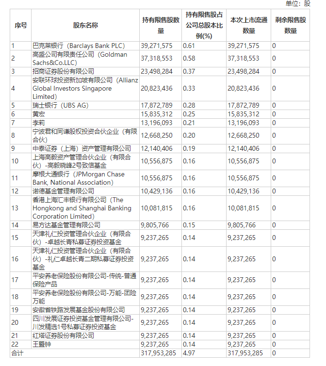 以伊利股份6月9日的限售股解禁为例,本次非公开发行限售股上市流通共涉及3.18亿股。这些股份的持有人包括巴克莱银行、高盛公司、招商证券、安联环球投资新加坡有限公司、瑞士银行、宁波君和同谦股权投资合伙企业(有限合伙)、中泰证券(上海)资产管理、上海高毅资产管理合伙企业(有限合伙)-高毅晓峰2号致信基金、摩根大通银行、诺德基金管理有限公司、香港上海汇丰银行、易方达基金等。