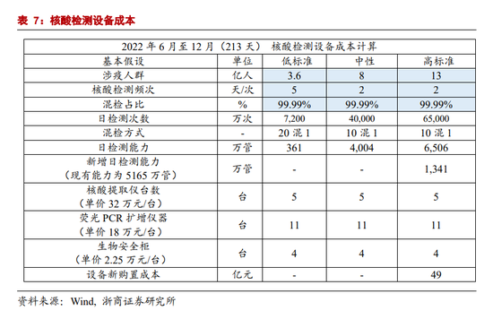 3)确定设备购置成本。根据《全员新型冠状病毒核酸检测组织实施指南(第二版)》要求,按照每日检测1万管,需匹配96孔核酸提取仪器4-6台,96孔PCR扩增仪器10-12台,A2型双人生物安全柜4个。我们通过公开的医院核酸检测设备采购公告得到相关设备的单价,分杯处理系统32万元/台,全自动核酸提取仪5万元/台,荧光定量PCR扩增仪 18万元/台,卧式压力蒸汽灭菌器 5万元/台,生物安全柜2.25万元/台。我们认为购置新设备必然是当前日检测能力上限不足,需进一步提升,满足长期常态化核酸检测能力必须匹配相对应的设备储备(类似提高产能需要扩大制造业投资)。2022年4月17日国务院联防联控机制披露,截至目前全国有1.31万家医疗卫生机构具备检测能力,检测能力达到每天5165万管。我们据此判断,若所需检测能力超过5165万管则需要进一步购置新设备。综合来看,中性预测下,6月至12月核酸检测设备无需进一步增加购置。