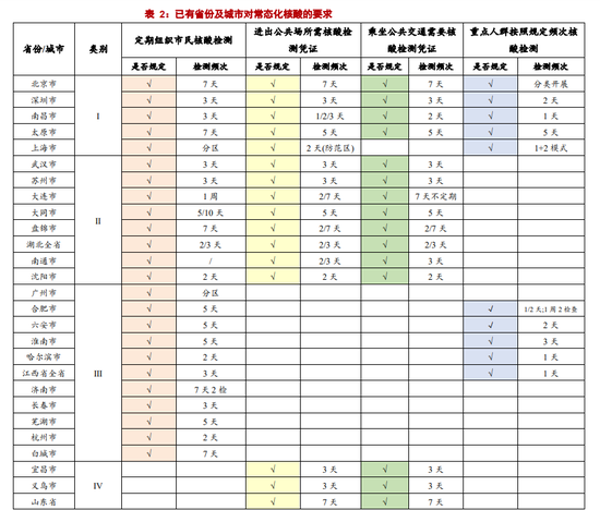 通过深入分析各个地区常态化检测方案,我们归纳得出主要有四种核心方式,分别是:1)定期组织市民核酸检测;2)进出公共场所所需核酸检测凭证;3)乘坐公共交通需核酸检测凭证;4)重点人群按照规定频次进行核酸检测,并在此基础上对已开展高频核酸检测的省份和城市归为四档: