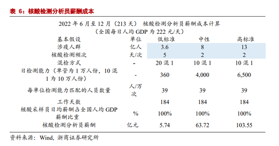 2)核酸检测分析员总薪酬的确定。根据《全员新型冠状病毒核酸检测组织实施指南(第二版)》要求,按照每日检测1万管(单管为1万人份、5混1为5万人份,10混1为10万人份)所需要准备的检测能力,设置新冠病毒核酸检测人员24-25人,相关辅助人员15人。同时,通过第三方招聘机构的招聘启事,我们对核酸检测分析师的薪酬进行了调查,核酸分析员日薪占当地每日人均GDP在42%-139%之间。此外,根据招聘启事,我们认为,中性预测下核酸检测分析员每周工作六天、休息一天,薪酬与全国每日人均GDP保持一致(2021年为每日222元/人)。综合来看,中性预测下我们认为6月至12月核酸检测分析员总薪酬在63.72亿元。