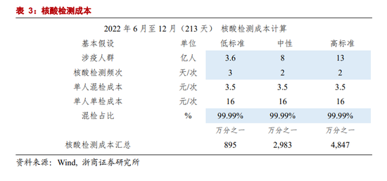 3)每人次核酸检测单价。2022年4月8日医保办发〔2022〕5号发布,明确要求“下调公立医疗机构新冠病毒核酸检测的政府指导价,各省份要将单人单检降至不高于每人份28元;多人混检统一降至每人份不高于8元。实行检测价格和试剂价格分开计价收费的省份,要按照不高于上述水平设置封顶标准”。随着大规模核酸检测的应用,不同省份对核酸检测成本进行不同程度上的下调,北京宣布自5月3日起北京新冠病毒核酸单样本检测价格由每次24.9元降低至19.7元,混合检测价格同步由每样本5.9元降低至3.4元;湖北5月9日发布鄂医保发〔2022〕31号文,要求单人单检价格由每次28元将至 24元,混检价格由每人次8元降至4元。我们预计常态化核酸检测推广将以大规模混检+精准单检的方式配合,常态化核酸检测的检测方式为“十混一”混检测试,单检重在应用于对高风险人群进行确诊等方面,保留万分之一的单检比例是较为合适的。此外,考虑大规模常态化核酸检测的应用推广,单人混检及单人单检的核酸检测价格有望进一步调降,预计单人单检成本逐步进入15-20元区间,单人混检价格将逐步进入3至4元区间。中性情况下,考虑常态化核酸检测大面积铺开后成本大概率进一步下行,我们预计核酸检测混检成本在3.5元/人,单检成本在16元/人。综合来看,我们认为随着常态化核酸检测的大规模推广,能够对疫情防控起到较好的管控作用,中性预测下涉疫人群在8亿人,混检比例为99.99%(即单检为万分之一比例),核酸检测频次为2天一次(即出行必须持48小时核酸)情况下,自6月起至12月底核酸检测成本在2983亿元。