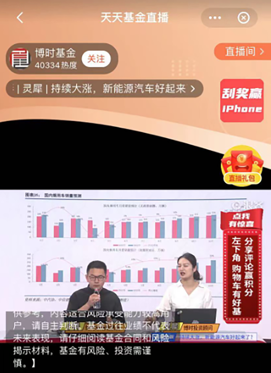 6月8日,博时基金在天天基金网路演,讨论新能源汽车话题,热度超过了4万;工银瑞信基金以“锂电池,大机会”为话题的直播路演,热度超过了3.3万。