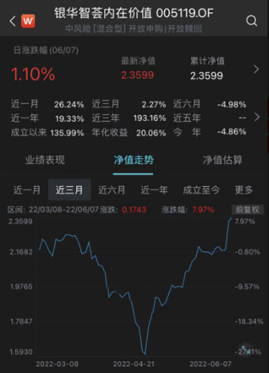 从净值表现来看,银华智荟内在价值基金净值在4月26日跌至低点,1.593元。随着市场反弹,该基金净值在4月27日快速反弹,单日大涨9.53%;在随后的时间里,银华智荟内在价值基金净值在4月29日、6月6日表现亮眼,单日净值增长率分别达到5.62%、7.18%。截至6月7日,银华智荟内在价值基金净值达到2.36元。