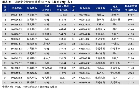 个股层面上看,保险资金当前前五大重仓股分别为平安银行、招商银行、浦发银行、兴业银行和长江电力。