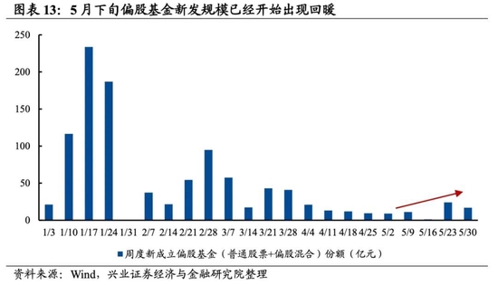 虽然5月偏股基金新发规模进一步走低,但从周度数据看,随着市场持续回暖,5月下旬开始新成立偏股基金的份额环比已经开始出现回暖。