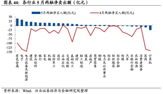 从行业结构来看,5月两融流出有色金属、电子、电力设备及新能源等行业居多。5月两融资金净流入有色金属、电子、电力设备及新能源、建筑和食品饮料行业居前,流出计算机、医药、消费者服务、农林牧渔、非银行金融等行业居多。当前两融余额较高的前四大行业分别是医药、电子、非银行金融和电力设备及新能源等。