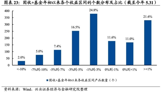 固收+产品回撤幅度明显降低,股票仓位处于较低水平,随着市场企稳、后续加仓意愿或有望提升。由于年初至今市场回调较大,导致部分固收+产品回撤较大,市场普遍担心被动赎回引发负反馈。截止今年5月31日,固收+产品今年收益率中位数为-1.45%左右,市场回暖后收益率回撤的幅度较前期明显缩小,引发负反馈的概率较小。当前有30.9%的固收+产品收益率低于-3%,仍存在一定业绩压力,考虑到当前市场已经处于底部区域且逐步回暖,且固收+产品股票仓位已经处于近两年较低水平,后续加仓意愿有望提升。