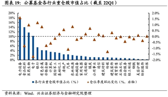 从行业结构来看,截至2022年Q1,公募基金重仓股行业占比居前的行业分别为:为电力设备(17.6%)、食品饮料(14.0%)、医药生物(11.7%)和电子(10.2%)。