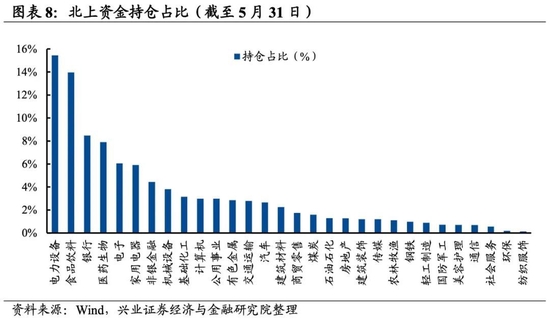 持仓结构方面,截至5月31日,北上资金的前五大重仓行业分别是电力设备(15.4%)、食品饮料(14.0%)、银行(8.5%)、医药生物(7.9%)和电子(6.1%)。