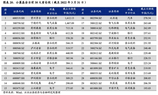 从个股层面来看,22Q1公募基金前五大重仓股为贵州茅台、宁德时代、药明康德(维权)、隆基股份和招商银行等。