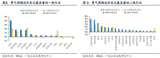 (2)“广发策略·高频预期景气观测框架”。我们发现,诸多行业的超额收益与行业的高频预期景气边际变化方向显著相关,因此我们自21.8.29《中报季如何布局市值下沉?》起持续应用“高频预期景气观测框架”进行行业比较。我们观察各个行业6月10日相对5月末的景气预期边际变化,寻找当前景气预期改善最为明显的行业。截止6月10日收盘,一级行业中通信、商贸零售、计算机、公用事业、轻工制造的盈利景气预期边际改善最为显著,公用事业、通信、农林牧渔、石油石化、环保的收入景气预期边际改善最为显著。二级行业中互联网电商、通信设备、物流、电力、家居用品的盈利景气预期边际改善最为显著,航运港口、通信设备、电力、元件、石油石化的收入景气预期边际改善最为显著。