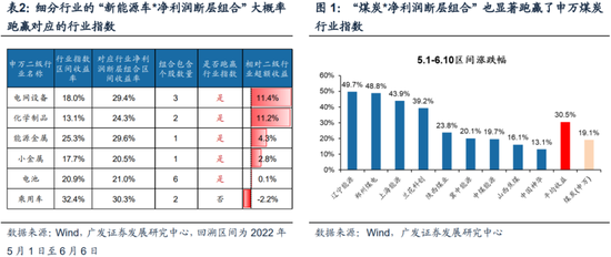 (1)“广发策略·净利润断层行业多空框架”。我们在2.15《净利润断层在行业比较中的应用》中介绍了“净利润断层行业多空框架”,印证了从年化收益率、夏普比率、最大回撤三大方面来看,净利润断层占比前三、前五行业指数组合均显著跑赢万得全A。本期净利润断层策略于22年5月进行了新一轮的调仓后,净利润断层占比前五的行业分别是煤炭、公共事业、房地产、食品饮料、基础化工。