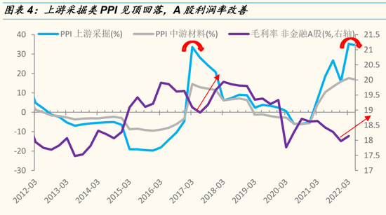 过去3-4季度,在上游资源品涨价背景下,上游挤压中下游利润的现象尤为显著。下半年在供需两端压力之下,资源品涨价或趋缓(具体逻辑请参考我们中期策略报告“从反弹到反转”)。当上游采掘PPI高位回落时,由于价格传导存在一定的滞后性,中游材料PPI和生活资料PPI往往有段时间趋于平稳甚至惯性向上,此时中下游板块上市公司毛利率将明显改善。这对于受上游成本困扰的中下游公司来说,会对业绩形成明显支撑。而中下游公司占A股非金融企业利润比重相对较高,其利润率改善也将拉动整体A股非金融企业盈利。也就是说,即使下半年经济恢复弹性相对温和,利润率改善这一微观变化也将对企业盈利形成支撑。
